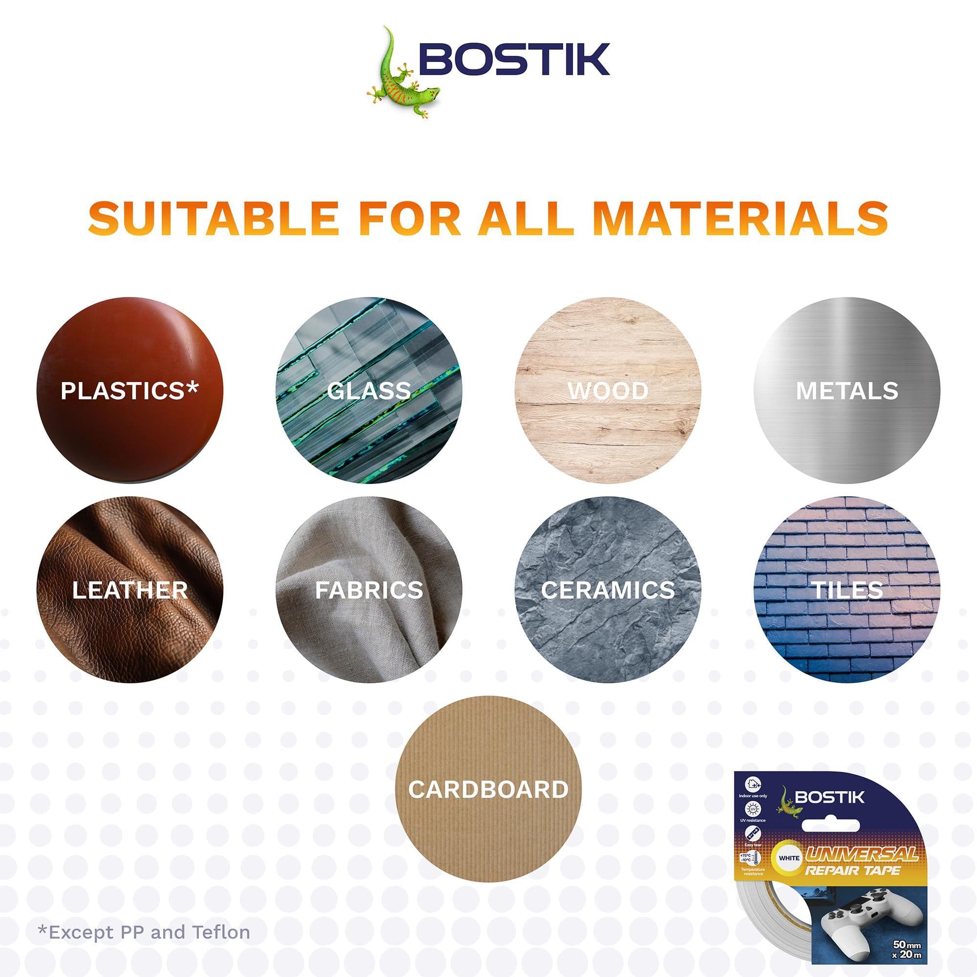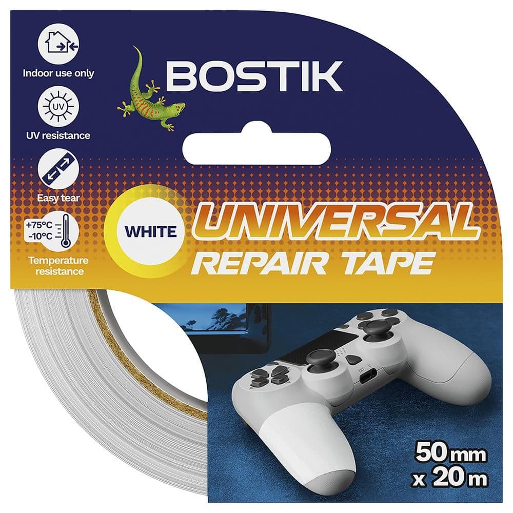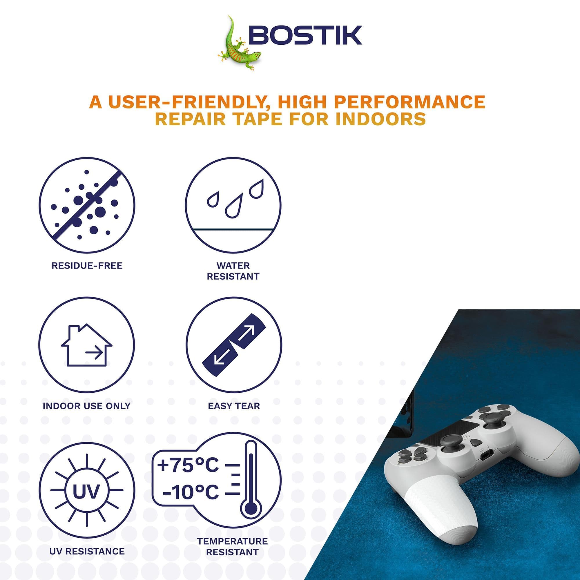 Bostik Universal Repair Tape is a versatile and reliable indoor repair tape for all your basic repair and maintenance needs, also referred to as ‘duct tape’ or ‘gaffer tape’. This strong white fixing tape is designed to blend seamlessly with most surfaces, providing both functionality and aesthetic appeal. The high strength tape provides a durable bond, so repairs remain fixed and secure over time. Whether you’re working with wood, metal, plastic, rubber, leather, stone, and more, this strong duct tape adheres effortlessly to most materials, offering un-paralleled versatility. It’s built to resist UV light and temperature fluctuations to ensure long-lasting performance and has low odour, so is pleasant for indoor use. The unique formula also offers a residue-free removal, ideal for temporary fixes and more delicate substrates. Plus, say goodbye to scissors! This repair tape can be easily torn by hand, allowing for quick application and hassle-free fixes. Perfect for patching up and holding together household items, repairing and sealing cracks, or almost any DIY project - Bostik’s Universal Repair Tape serves as your go-to cloth tape for indoor substrates.