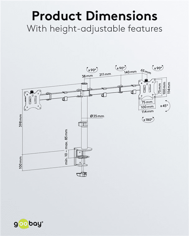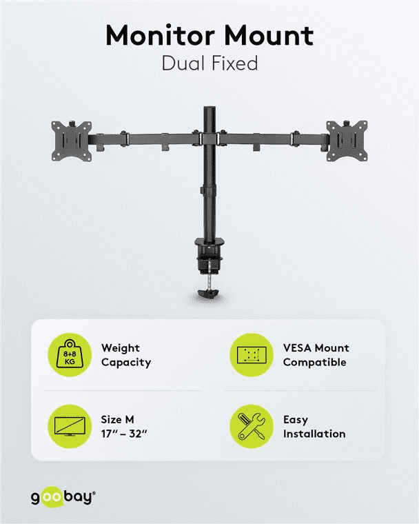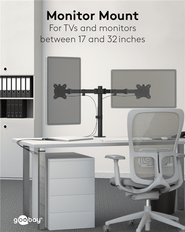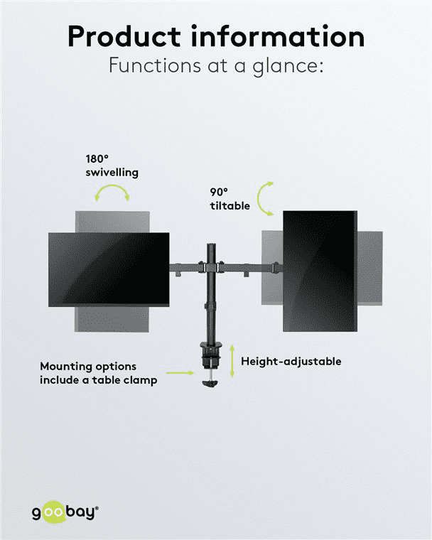 This monitor mount is the perfect addition to the ergonomic workplace and adapts to all of your everyday requirements. Suitable for mobile office, gaming or multimedia applications: You can easily and flexibly adjust the monitors for an ideal viewing angle. The compact stand creates additional space on the desk and ensures a clean look.