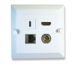 This HDMI wall plate is the ideal solution for connecting neatly between equipment, faceplates are fitted with 1x HDMI socket (4k), 1x USB Type C (USB 3.2), 1x Ethernet (CAT6) and 1x TV Aerial Socket, Easy connect - cables can be attached easily to both the front and reverse of the plate.