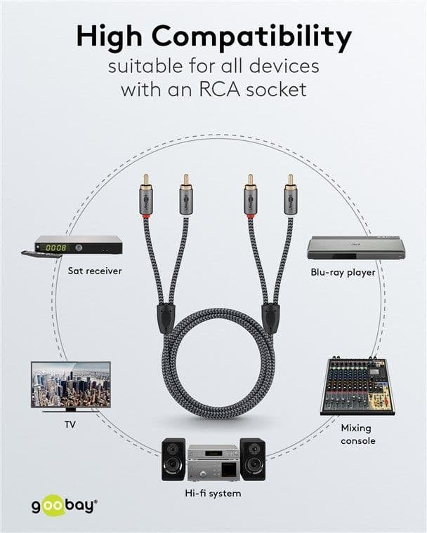 - Highly flexible premium RCA cable with slim metal plugs, bend protection and a colour-matched textile cable